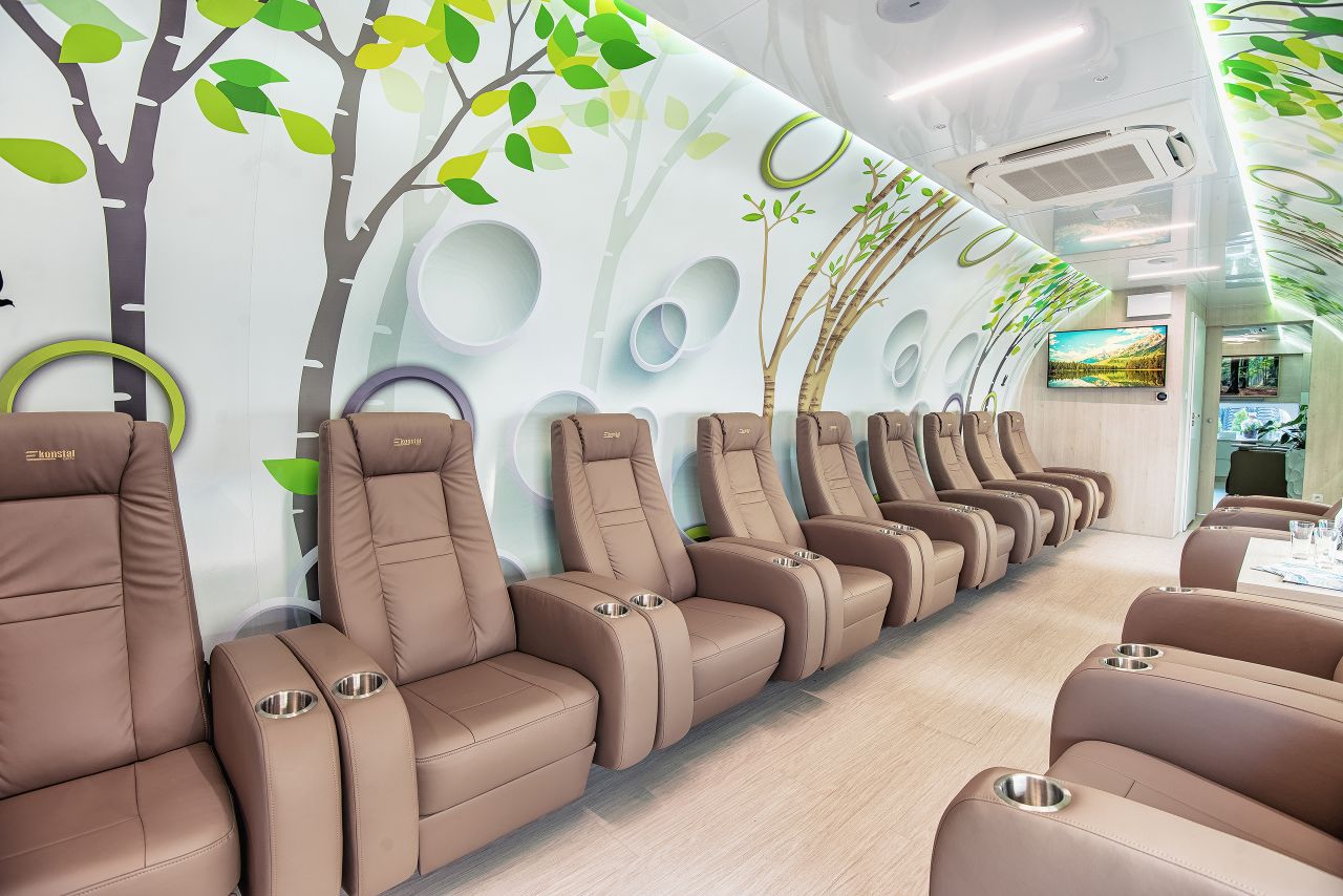 Sesja w czteroosobowej strefie VIP. Fotele rozkładane do pozycji leżącej, kawa, herbata, toaleta, woda wodorowa.